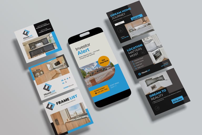 Take your listings and brand to the next level with custom real estate marketing content that attracts attention and drives results. FrameList Media offers flyers, brochures, social media graphics, logos, and full brand identity design—everything you need for a consistent, professional image that stands out.